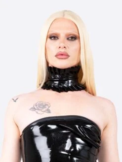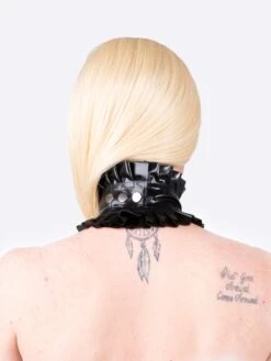 A bold statement piece, this ruffled latex neck band combines high-fashion drama with edgy sensuality. Crafted from glossy, form-fitting latex, it features exaggerated ruffles that wrap elegantly around the neck, creating a striking silhouette. Perfect for performances, editorial shoots, or daring fashion moments, this accessory exudes confidence and avant-garde sophistication.